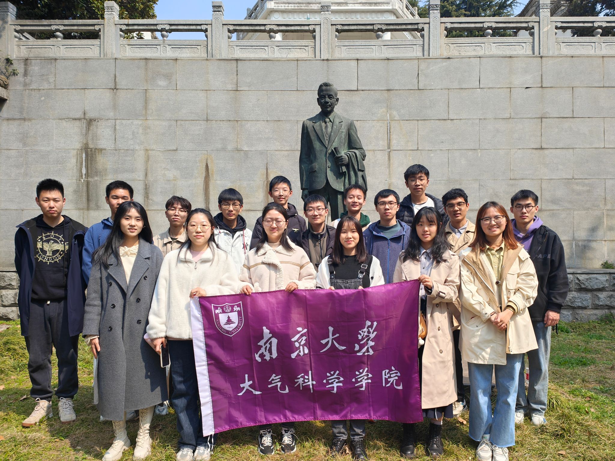 再次拾级而上,就看到了白塔般的观象台下屹立的竺可桢铜像。在讲解员的介绍下,同学们了解到竺可桢先生曾任国立中央大学地学系的系主任,是中国科学院院士,中国近代气象学家、地理学家、教育家,中国近代地理学和气象学的奠基者,也是中国最早的气象高等教育基地,即南大气象学系的缔造者。听罢老一辈气象学家的故事,同学们尤为一代代气象工作者的家国情怀和无私奉献精神折服和触动,进一步增强了气象文化自信,坚定了气象报国之志。